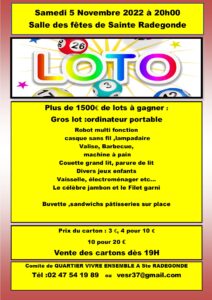 Le comité de quartier Vivre ensemble à Sainte Radegonde (VESR) organise son loto annuel le samedi 5 Novembre 2022 à 20h à la salle des Fêtes de Sainte Radegonde. De nombreux lots à gagner dont le gros lot: un ordinateur portable, sans oublier le Jambon et le filet garni. Restauration sur place ( sandwichs, pâtisseries, boissons)