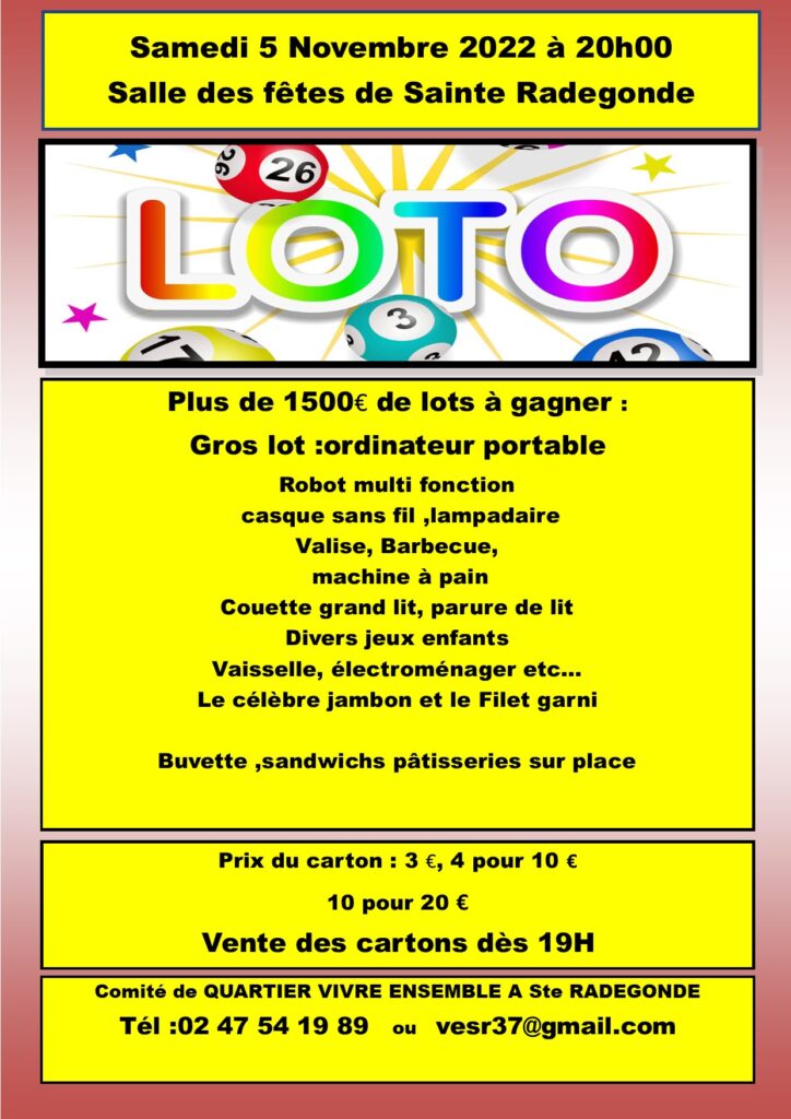 Le comité de quartier Vivre ensemble à Sainte Radegonde (VESR) organise son loto annuel le samedi 5 Novembre 2022 à 20h à la salle des Fêtes de Sainte Radegonde.